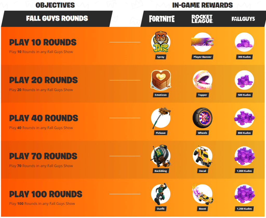 - Juega 70 rondas en cualquier show (0/70) – Recompensa en Fall Guys: 1.000 Elogios; Recompensa en Fortnite: accesorio mochilero Gofrera; Recompensa en Rocket League: calcomanía Cluster Buster para el Octane