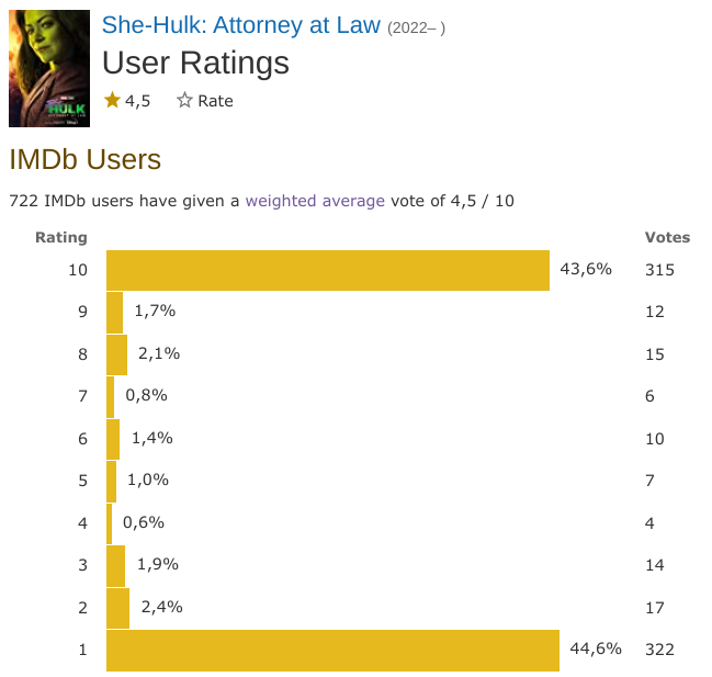 Al momento de escribir esta nota, la serie de She-Hulk cuenta con una calificación 4,5/10, la cual durante las últimas horas ha disminuido debido a una oleada de malas calificaciones, logrando que casi el 45% de las evaluaciones registradas en el portal, sean nota 1.
