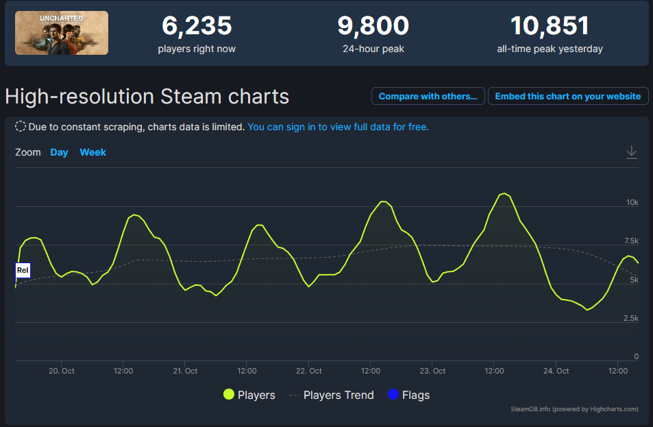 Con un peak que ni siquiera superó los 11 mil jugadores conectados al mismo tiempo, Uncharted: Legacy of Thieves Collection tuvo un opaco debut en PC.