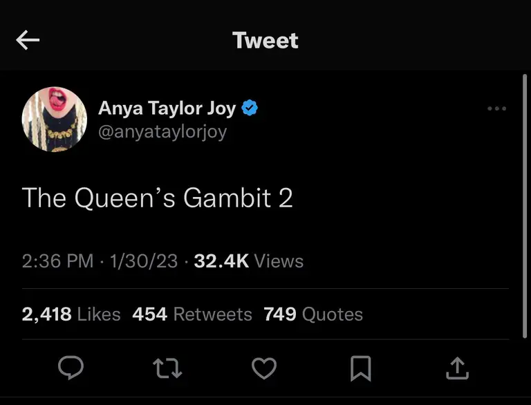 El día de ayer Anya Taylor-Joy sorprendió a todos con un tuit aludiendo a una segunda temporada de Gambito de Dama, el cual rápidamente fue borrado, pero que aun así quedó registro de su existencia.