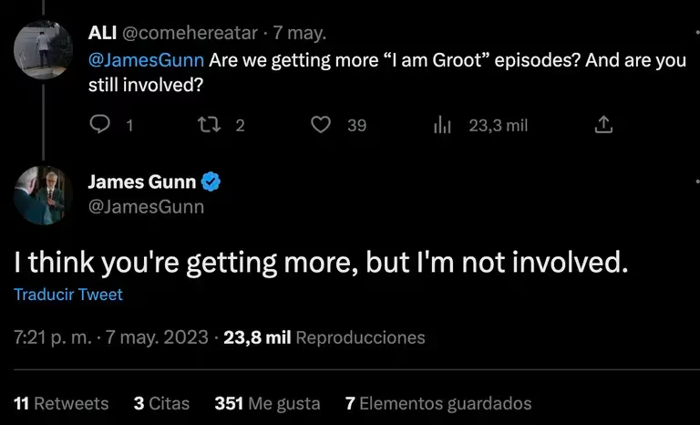 A través de la red social, un seguidor le consultó a Gunn si la serie animada Yo Soy Groot tendría nuevos episodios, a lo que el director respondió “Creo que recibirá más, pero no estoy involucrado”.