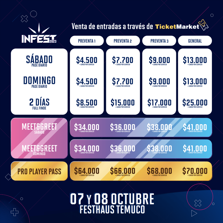 Infest 2023 se llevará a cabo el próximo 7 y 8 de octubre en Festhaus Temuco (ubicado en Rudecindo Ortega 02351). Las entradas para el evento está a la venta a través del sistema TicketMarket, donde durante su segunda preventa, el pase diario tiene un valor de $7.700.