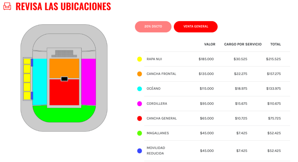 Las entradas tendrá un valor de $52.425 hasta $215.525, mientras que los clientes de Entel y Scotia podrán acceder a un 20% de descuento.