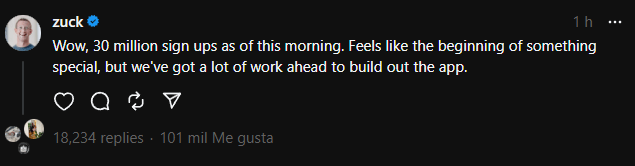 Aunque no existen cifras oficiales, el propio Mark Zuckerberg, a través de su nueva red social, ha ido actualizando el avance de Threads, dio a conocer que durante la tarde de ayer, Threads sumó 7 millones de usuarios durante la tarde.