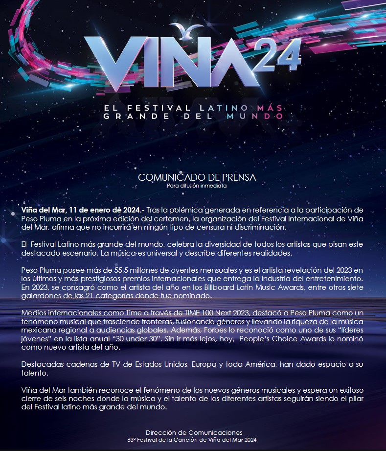 “Tras la polémica generada en referencia a la participación de Peso Pluma en la próxima edición del certamen, la organización del Festival Internacional de Viña del Mar, afirma que no incurrirá en ningún tipo de censura ni discriminación”, comienza señalando el comunicado.