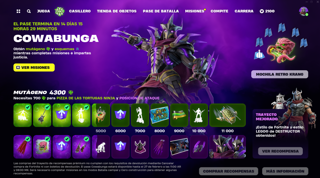 PASE COWABUNGA: Avanza por el trayecto de recompensas gratuito del Pase Cowabunga para desbloquear la mochila retro Pizza de las Tortugas Ninja, bajo Kuro Kabuto para uso en Fortnite Festival, planeador Dirigible tortuga construido por Donatello, ¡y mucho más! Al comprar el trayecto de recompensas premium, se desbloquea automáticamente el atuendo Destructor y se obtienen recompensas adicionales, como pico Garras de acero de Destructor, la mochila retro Capa de Superdestructor y, por supuesto, la recompensa final: el atuendo Superdestructor, sin necesidad de realizar misiones adicionales. Tanto el atuendo Destructor como el de Superdestructor tienen un estilo Fortnite y LEGO. Para más información sobre el Pase Cowabunga, visita el blog de Fortnite.
