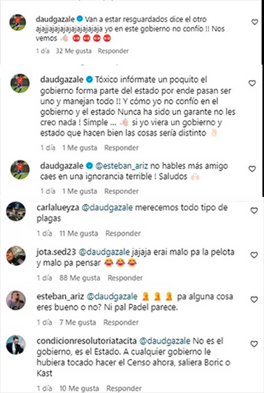 “Yo en este gobierno no confió”, partió señalando el exfutbolista, quien desconfía de la seguridad y uso que se le darán a los datos reunidos por este mecanismo. “Tóxico, infórmate un poquito, el gobierno forma parte del estado por ende, pasan a ser uno y maneja todo”, continuó el descargo de Gazale.