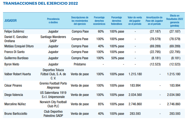 Uno de los puntos que más llama la atención a los hinchas es el dinero recaudado en concepto de ventas de jugadores, en donde el año 2022 se recaudó más de 6,4 millones de dólares por las ventas de jugadores como Valber Huerta, César Pinares, Diego Valencia, Marcelino Núñez y Bruno Barticciotto.