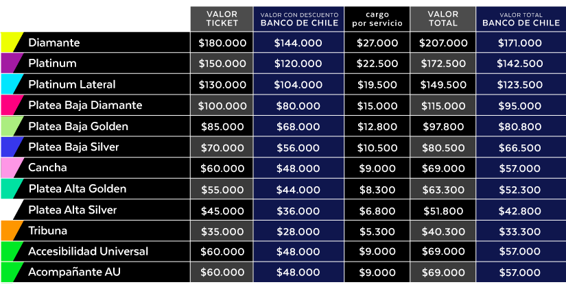 El valor de las entradas, para público general, va desde los $40.300 hasta $207.000, donde los clientes de Banco de Chile podrán acceder a un 20% de descuento en la entrada sin contar cargo por servicio.