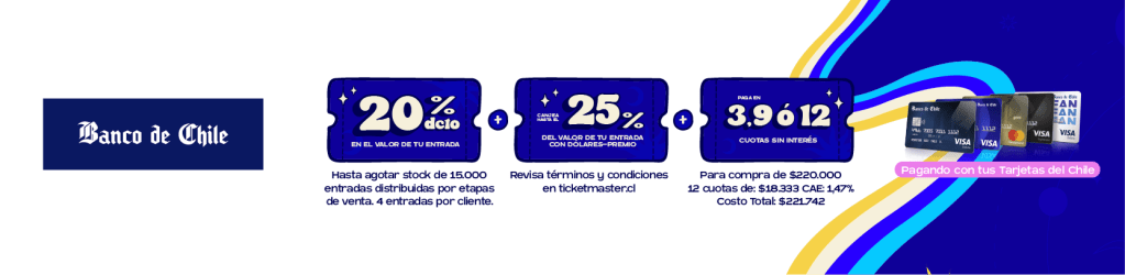 Banco de Chile: 20% de descuento, pagando con cualquier tarjeta de Banco de Chile, en 3, 9 ó 12 cuotas sin interés, y pagando hasta un 25% del total con dólares premio, distribuidos entre todos los tipos de pases y etapas desde Preventa 1. Cada descuento permite comprar máximo cuatro entradas.