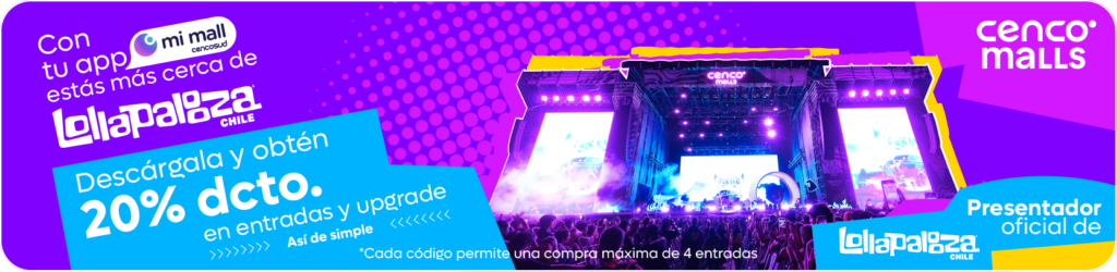 Cenco Malls: 20% de descuento. Ingresa a su APP Mi Mall, y busca el banner de Lollapalooza Chile en la pantalla principal o en la sección “promociones”, y le das clic a “Obtén descuento”. Ahora, guarda el código e ingrésalo en Ticketmaster al momento de realizar la compra.