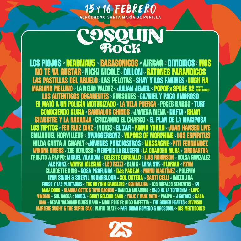 El cartel de Cosquín Rock 2025 incluirá, en la jornada del sábado 15, la banda argentina de rock liderada por Ricardo Mollo, Divididos; Wos, referente argentino del freestyle y una de las voces más disruptivas del nuevo rap latino; la icónica banda argentina de rock alternativo Babasónicos; al grupo musical argentino de pop rock Airbag, integrada por los hermanos Patricio, Gastón y Guido Sardelli; el cantante argentino Dillom; y la emblemática banda de rock y ska Los Auténticos Decadentes.