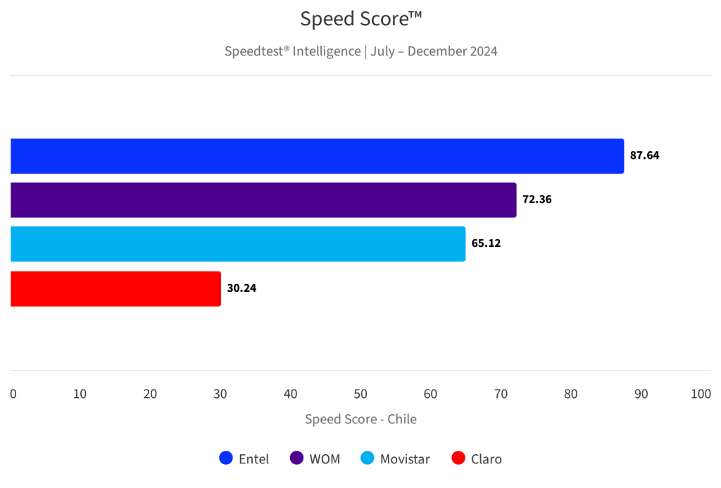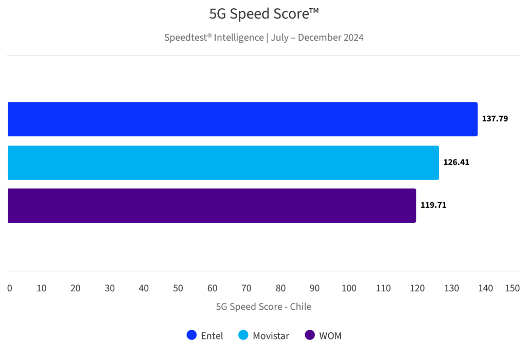 Entel fue la operadora que entregó el servicio de internet móvil más rápido en Chile, con una velocidad promedio de 87,64 Mbps, y 137,79 en redes 5G. De ahí le sigue WOM, con 72,36 Mbps, y Movistar en redes 5G, con una velocidad promedio de 126,41 Mbps.