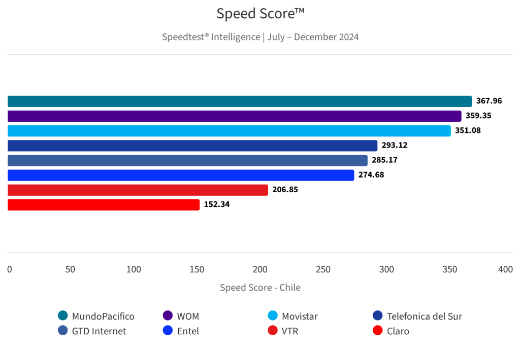 Por otra parte, en internet hogar, Mundo entregó el servicio más rápido, con una velocidad promedio de 367,96 Mbps de descarga, seguida por Wom (359,25 Mbps) y Movistar (351,08 Mbps)
