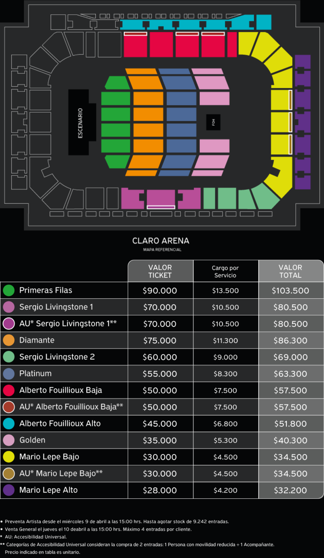 La venta de entradas para el concierto de Miranda en el Claro Arena inicia este 9 de abril, a través del sistema PuntoTicket, a las 15 horas con una preventa exclusiva para fans, mientras que la venta general inicia un día después. Las entradas podrán ser adquiridas desde $32.200 hasta $103.500.