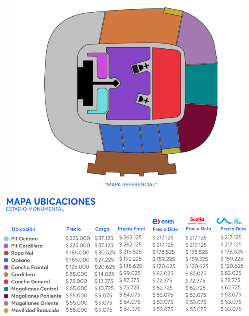 El valor de las entradas va desde $64.075 hasta $262.125, donde los clientes Entel, pagando con tarjetas Scotia o los afiliados a Caja Los Andes, podrán acceder a un 20% de descuento en cualquiera de las entradas.