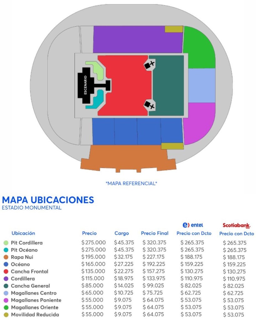 El valor de las entradas va desde $53.075 hasta $265.375, donde los clientes Entel o pagando con tarjetas Scotia, se podrá acceder a un 20% de descuento en el valor de cualquiera de las entradas.