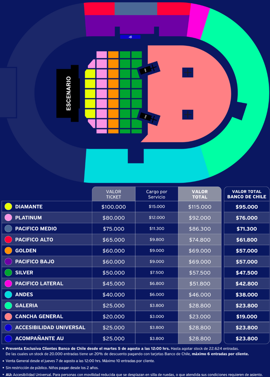 La venta de entradas para el concierto de Los Jaivas en el Estadio Nacional comienza, a través del sistema Ticketmaster, el próximo 5 de agosto con una preventa exclusiva para clientes Banco de Chile. La venta general comienza el 7 de agosto. El valor de las entradas va desde $23.000 hasta $115.000, donde pagando con tarjetas Banco de Chile, se podrá acceder a un 20% de descuento.