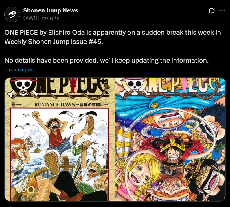 Lo que más llama la atención de los fans es que, normalmente, cuando Oda decide tomarse una semana de descanso, esto se informa en la última página del manga o se avisa con anticipación cuando se trata de un hiatus más largo. En esta ocasión no ocurrió ninguno de esos casos: simplemente no hubo capítulo y la propia Shonen Jump se limitó a comunicar la ausencia de publicación a través de X.