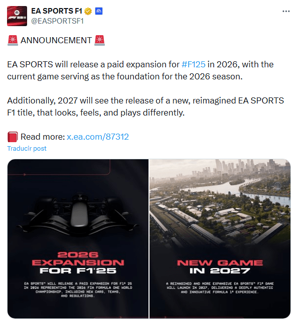 «La decisión de ofrecer una actualización de contenido premium para F1 25 forma parte de un reinicio estratégico para la franquicia F1. En 2027 se lanzará un nuevo juego que se ve, se siente y se juega de forma diferente, ofreciendo más opciones de jugabilidad«, señalan desde la compañía.