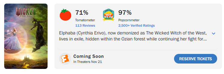 Esta semana se estrena Wicked Por Siempre, la segunda parte de la película estrenada en 2024, la cual con más de 100 reseñas publicadas en Rotten Tomatoes, tiene un 71% de aprobación en Rotten Tomatoes, quedando muy por debajo del 88% alcanzado por la primera entrega.