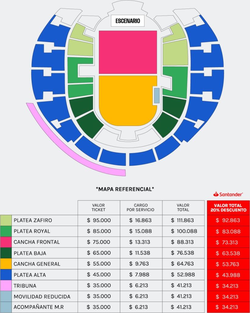 El valor de las entradas va desde $41.213 hasta $111.863, donde pagando con las tarjetas de banco Santander, se podrá acceder a un 20% de descuento.