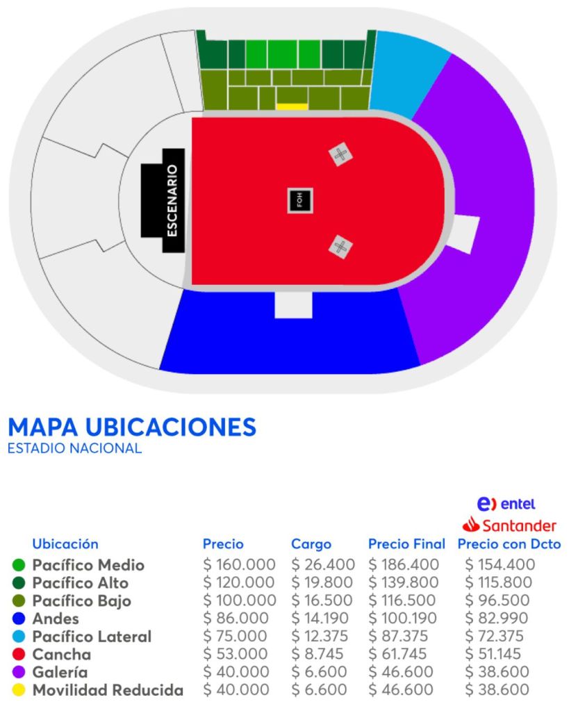 El valor de las entradas va desde $46.600 hasta 186.400, donde los clientes de Banco Santander y Entel podrán acceder a un 20% de descuento.