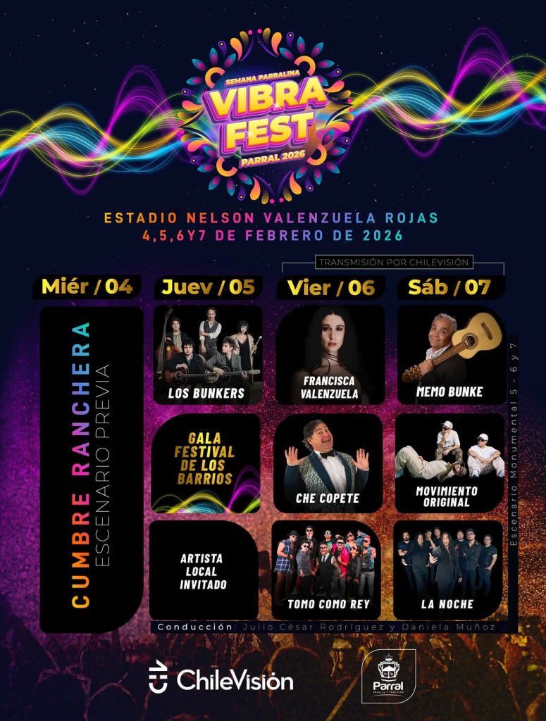 El festival Vibra Fest Parral 2026 se realizará entre el 4 y 7 de febrero en el Estadio Fiscal Nelson Valenzuela Rojas, y la entrada es totalmente liberada. Chilevisión transmitirá las últimas dos jornadas del evento, que será conducido por Julio César Rodríguez y Daniela Muñoz.