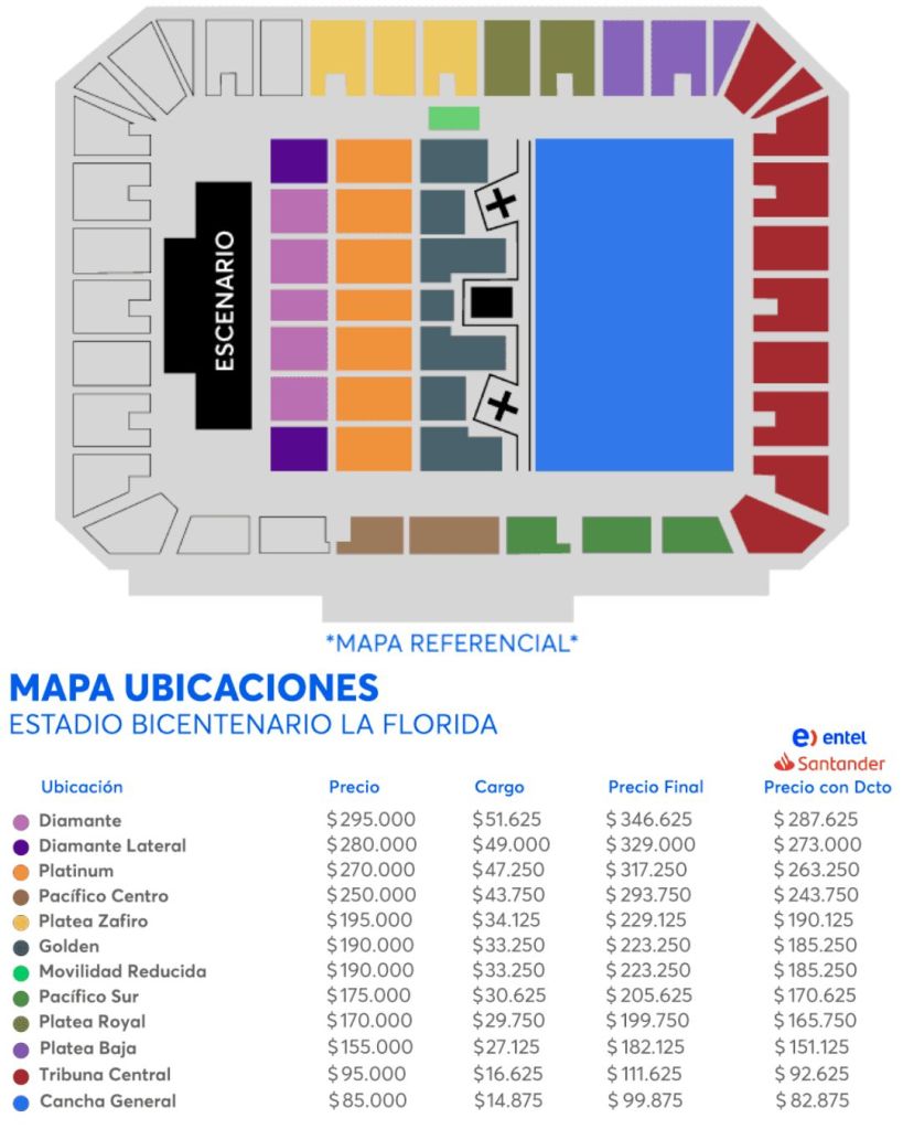 El valor de las entradas va desde $99.875 hasta $346.625, donde los clientes de Entel y Banco Santander podrán acceder a un 20% de descuento.